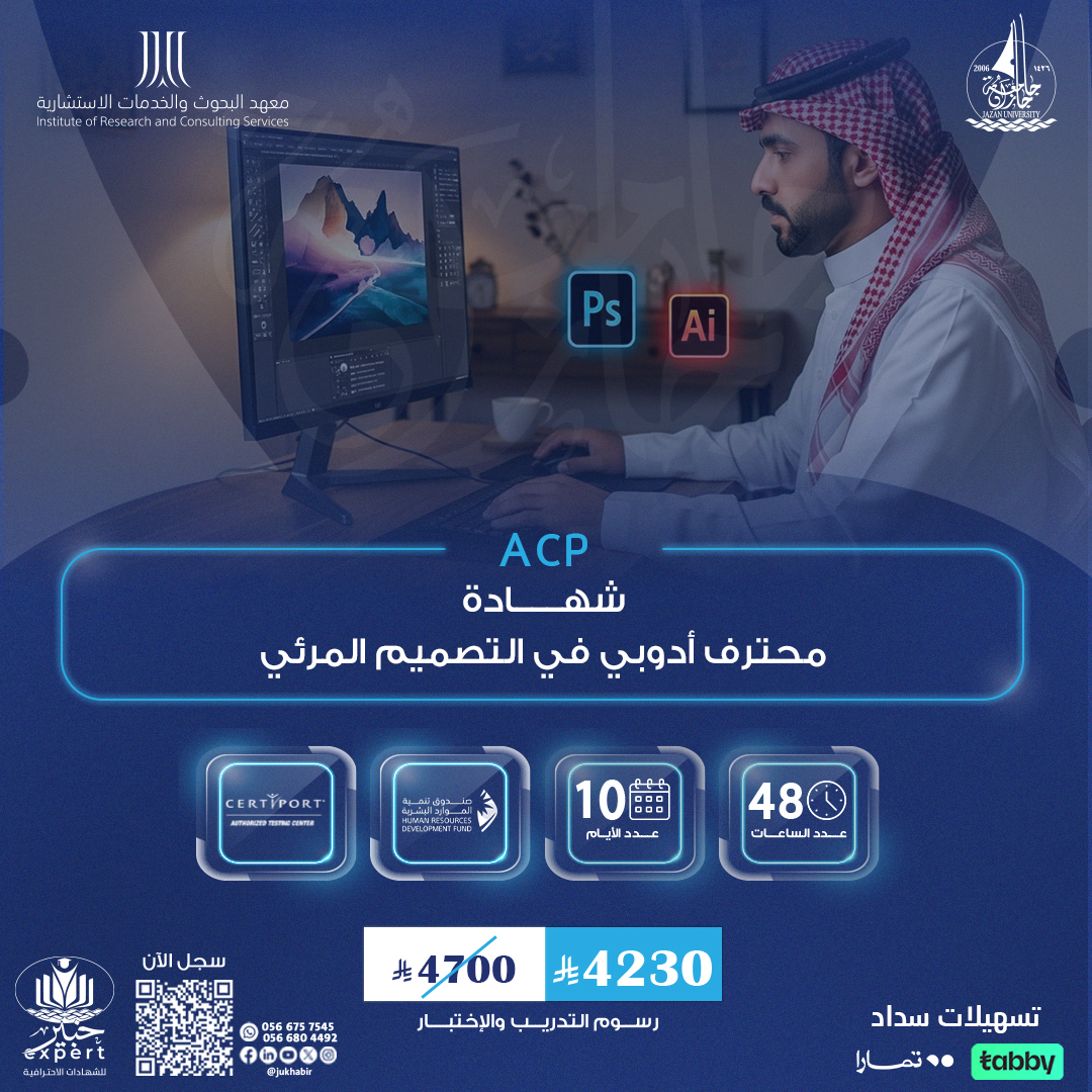 شهادة محترف معتمد من أدوبي Associate certified Adobe يهدف هذا البرنامج الى دعم احتياجات السوق المحلية بأفراد ذوي مهارات عالية في برامج التصميم الجرافيك، حيث تمنحهم القدرة على العمل في بيئة مختصة بالتصميم، مما يقدم الدعم للمؤسسات والشركات في هذا المجال وذلك بعدم اللجوء الى جهات خارجية للتصميم مما يقلل من التكاليف ويزيد من معدل الإنتاج.